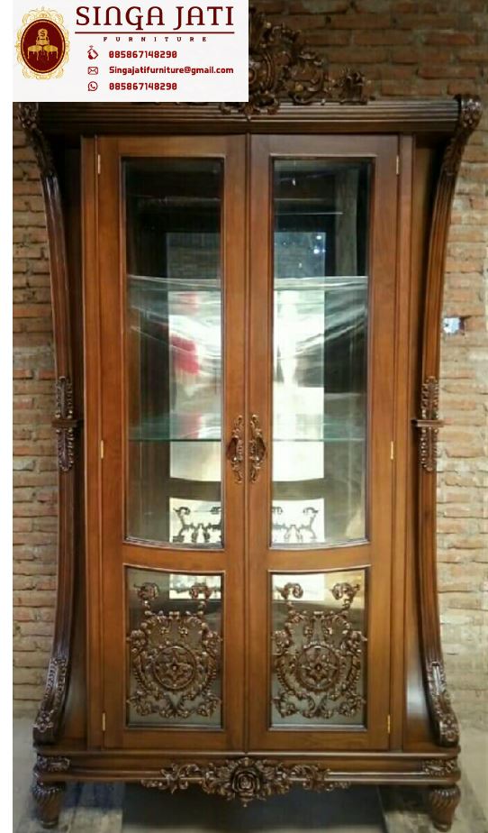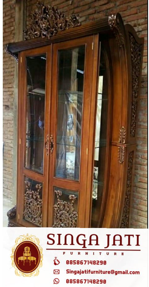 Almari kaca hias rafles adalah almari kaca untuk ruang tamu sebagai hiasan, almari kaca hias rafles mempunyai model minimalis yang elegant jadi anda bisa leluasa menempatkan almari kaca hias sesuai keinginan, almari kaca hias kami di produksi memakai bahan baku utama kayu jati TPK perhutani berkualitas, almari kaca hias rafles juga di hiasi dengan ukiran jepara yang menawan dan enak di pandang mata, itu bisa menghidupkan ruang tamu anda, selain bahan baku yang berkualitas almari kaca hias untuk ruang tamu ini juga terdapat beberapa keunggulan lainya, untuk anda yang ingin ruang tamu anda terlihat hidup serta elegan almari kaca hias rafles kami bisa menjadi pilihan yang tepat.