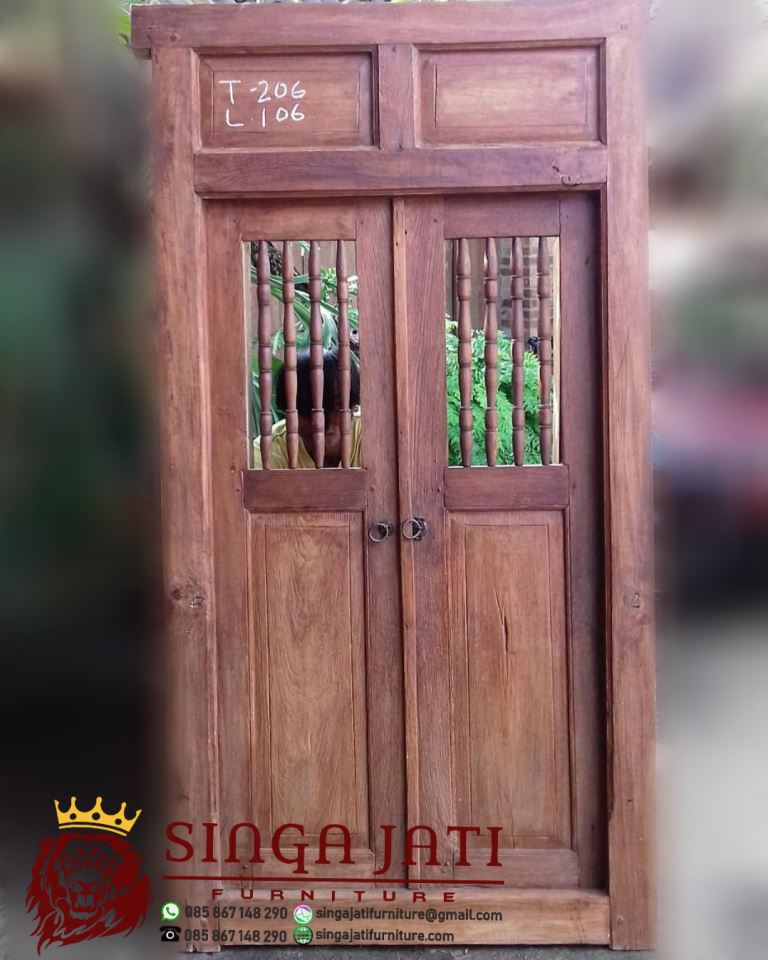 Gebyok antik kayu jati lawas memiliki ukuran berbeda-beda, model pintu rumah antik ini juga mempunyai banyak variasi salah satunya seperti pada gambar, untuk menambah penampilan supaya lebih menarik pada sisi pintu bagian atas di buat jendela jari-jari dan penutup jendela biasanya digunakan saat sore hari, pada bagian tarikan pintu atau handle kami menerapkan handle pintu klasik bentuk bulat terbuat dari kuningan asli.
