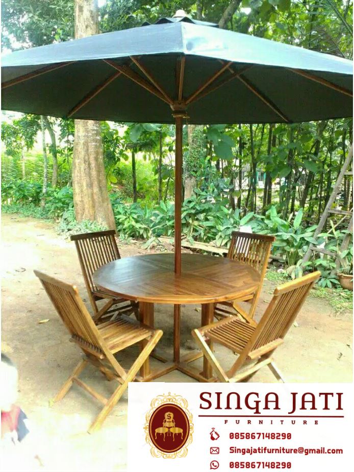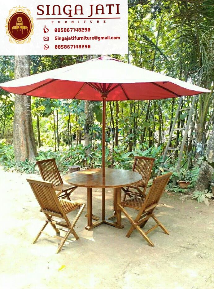Kursi lipat meja payung untuk taman atau pantai di buat dengan menggunakan bahan baku kayu jati berkualitas terbaik, konstruksi kursi lipat dan meja payung sangat kuat kokoh serta tahan lama, satu set kursi lipat dan meja payung memiliki formasi empat kursi dan satu meja dengan payung yang bisa di ambil atau tidak paten, model kursi lipat meja payung memiliki beberapa variasi model, seperti kursi lipat meja payung bulat, kursi lipat meja payung kotak, kursi lipat sandaran tangan meja payung, dan model yang paling terbaru kursi lipat meja payung yang menjadi satu, model terbaru kursi lipat ini menjadi primadona baru dikalangan pengusaha yang memiliki background outdoor.