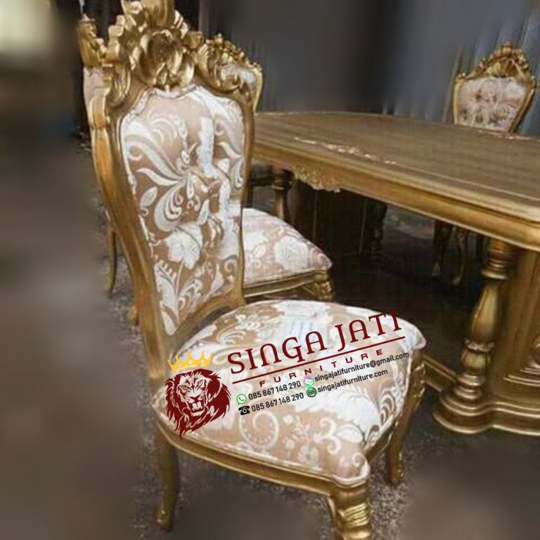Bagaimana saat pemasangan meja makanya ?, sangatlah mudah karena disisi bawah meja dan pada bagian kaki meja sudah di beri kuncian kusus supaya saat pemasangan anda tidak kesulitan. Kursi makan ukir juga terbuat dari bahan kayu jati, dengan hiasan ukiran bunga mawar yang di ukir oleh pengrajin asli Jepara menjadikan kursi makan sangat mewah, jumlah kursi makan ukiran bunga untuk meja makan tersebut berjumlah 8 pcs, dimana dua diantaranya memilki sandaran tangan dan lainya tidak terdapat sandaran tanganya selebihnya, model ukiran sama, kursi makan berkonsep sofa, terdapat kain jok yang indah bermotif, jenis busa kita menggunakan lG kalau anda belum tahu, tantang jenis busa tersebut sangatlah kenyal dan empuk ketika diduduki juga ebih awet di bandingkan dengan jenis busa lainya.
