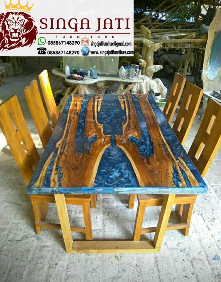 Meja makan kayu dengan ukiran mungkin anda sudah bisa melihatnya namun meja makan resin tidak semua orang pernah menjumpainya, nah.., kali ini saya akan mempersembahkan meja resin kepada anda, meja resin ini tetap memakai kayu trembesi solid tetapi ada yang bikin meja makan tersebut berbeda yaitu resin, meja makan kayu trembesi yang di kombinasikan bahan resin menjadikan meja makan ini mempunyai kesan mewah dan unik, meja makan resin kayu trembesi sudah mulai banyak diminati masyarakat Indonesia, terlebih coraknya yang unik bikin setiap orang terheran-heran dan terkagum-kagum selain kayu trembesi kami juga memproduksi meja makan resin kayu jati solid.