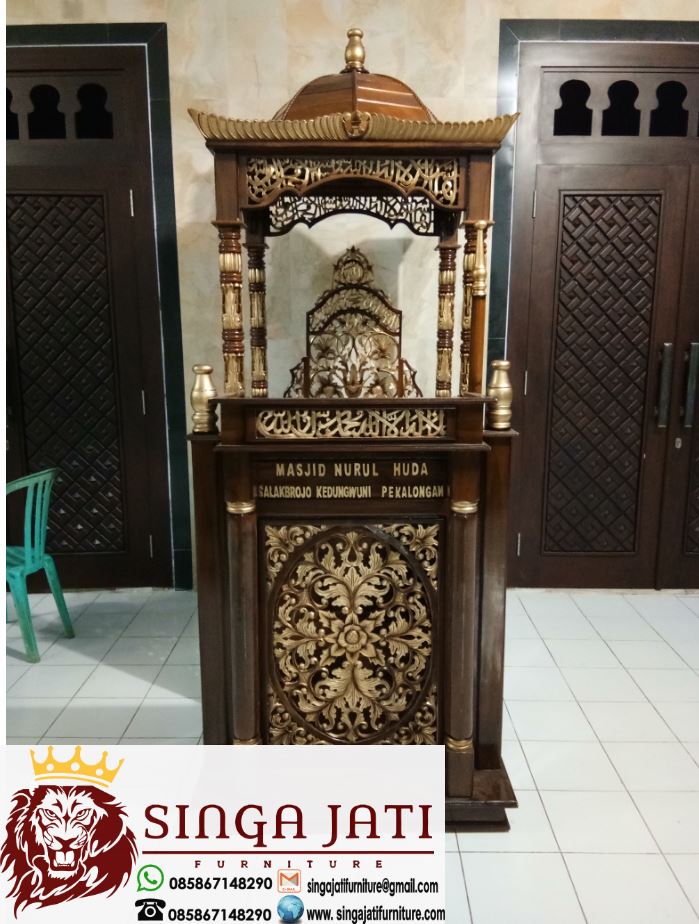 Mimbar masjid Pekalongan adalah salah satu produk dari singa jati furniture yang dipesan salah satu DKM di kota Pekalongan, mimbar masjid dengan model kubah di bagian atas menjadi pilihan, mimbar kubah memang menjadi primadona bagi para DKM, mimbar ukuran besar begitu serasi bila di letakan di sebuah masjid yang memiliki ukuran besar juga, namun ada beberapa mushola dengan tempat imam besar di padukan mimbar masjid atap kubah, selain mimbar masjid kubah kami jugamemproduksi mimbar podium dengan ukuran minimalis jika di bandingkan mimbar kubah, produk mimbar masjid di lengkapi dengan ukiran kaligrafi serta ukiran khas Jepara.