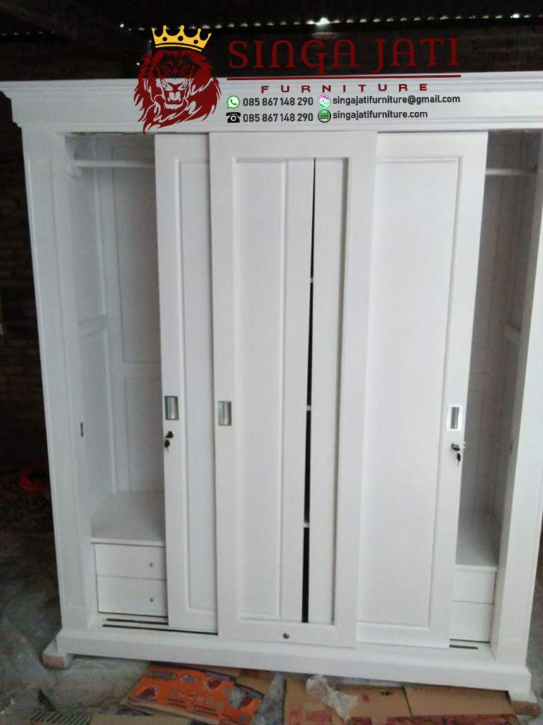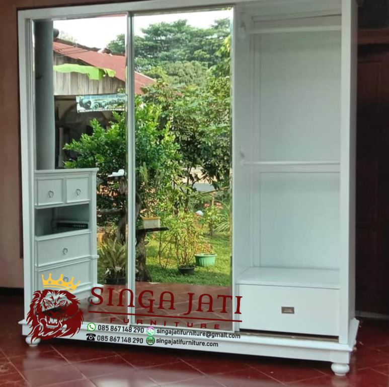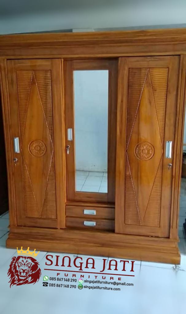 Lemari pakaian 3 pintu sliding dengan model minimalis membuat ruangan lebih luas. Sebab, furniture ini tidak membuat ruangan menjadi lebih sempit. Anda bisa memilih lemari pakaian 3 pintu yang berbahan kayu jati berkualitas.