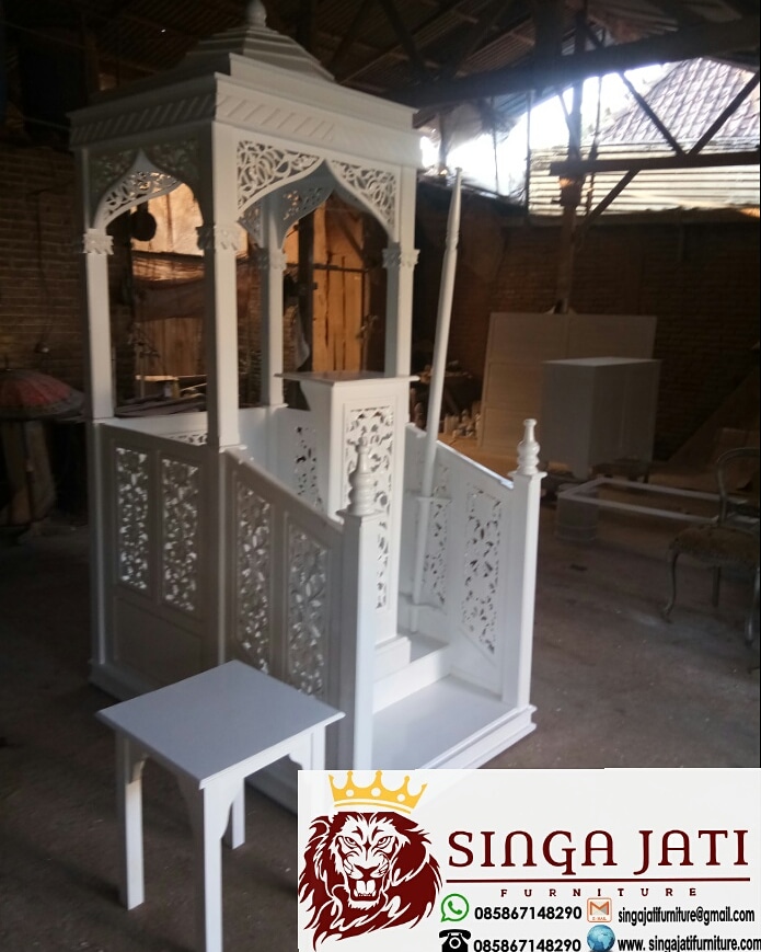 Mimbar masjid model kubah ukir warna putih kayu jati kebumen kini semakin beragam model bentuknya, dari mimbar minimalis hingga mimbar ukuran besar semua tersedia, singa jati furniture salah satu produsen mimbar masjid dari Jepara memproduksi sendiri mimbar masjid tersebut mulai model standar sampai custom pernah kita buat, salah satunya mimbar masjid kubah warna putih, banyak pula competitor yang membuat mimbar masjid, namun belum semuanya berhasil dalam hal finishing, salah satunya finishing warna putih dengan jenis cat duco, bukan perkara mudah dalam pewarnaan cat duco, selain prosesnya dua kali lipat dari warna natural, ada beberapa teknik yang wajib di lakukan, salah satunya menghilangkan getah yang terdapat pada kayu jati itu sendiri.