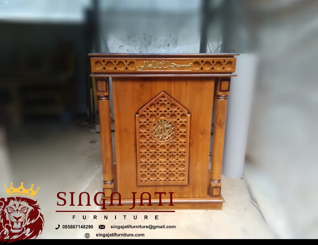Kayu jati memang menjadi salah satu bahan pembuatan podium yang terkenal dengan kekuatan dan ketahanannya. Podium ini memiliki desain yang minimalis dan memiliki penutup pada bagian depannya, ada juga kaligrafi Islam yang digunakan untuk mempercantik podium.