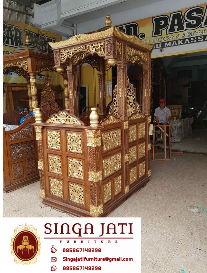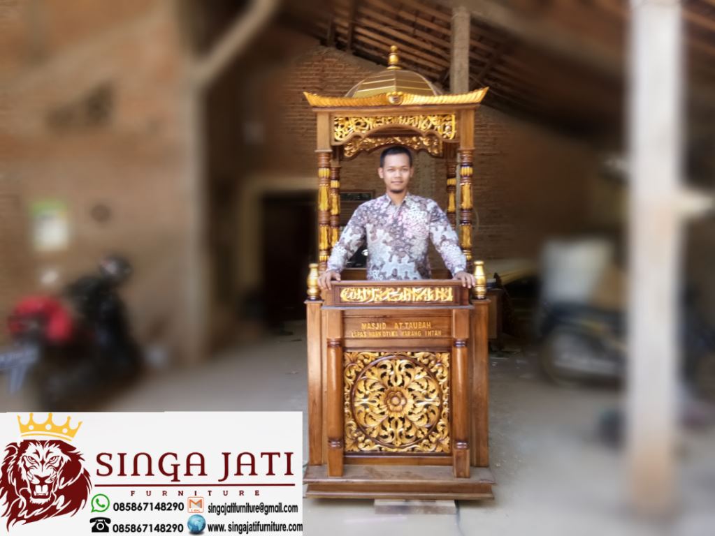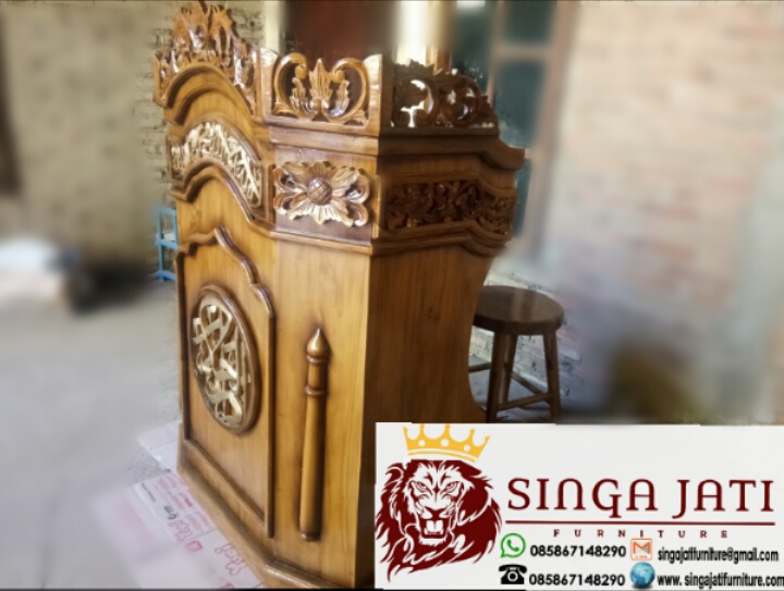 Mimbar podium kayu jati dari proses pemilihan bahan baku sampai finishing kami percayakan kepada tukang yang sudah berpengalaman di bidang furniture ataupun perkayuan, pada setiap prosesnya selalu kita perhatikan detail presisi sudut-sudutnya khususnya ukiran, karena ukiran membutuhkan kehati-hatian dalam memahat salah sedikit kayu bisa retak apalagi ukiran halus yang mengharuskan jarak setiap jengkalnya sangat tipis, selain mimbar masjid podium minimalis, kami juga sudah berpengalaman memproduksi model mimbar seperti, mimbar masjid atap kubah kaligrafi maupun mimbar custom lainya, semua produk mimbar kami memakai bahan full kayu jati, untuk pemesanan kalian bisa hubungi nomor tertera pada gambar maupun web yang sudah di sediakan, toko singa jati furniture sudah tebukti sebagai tempat berbelanja aman dan terpercaya.
